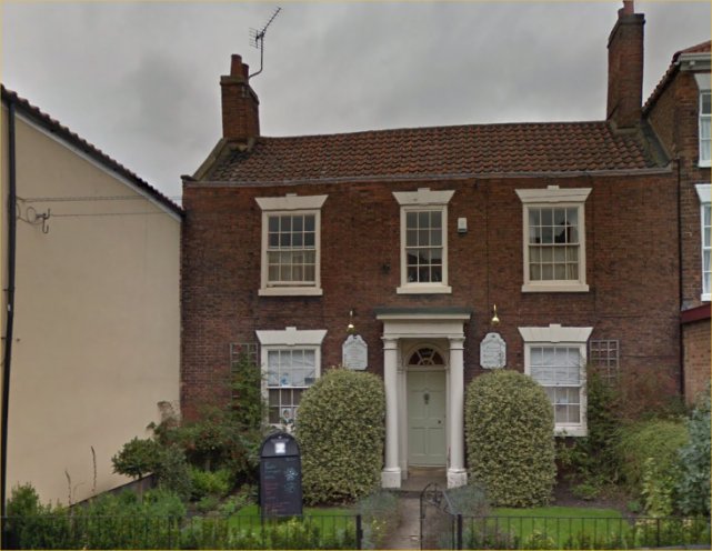 Grade II Early 19th Century. Two storeys in brown brick with pantile roof behind parapet. Three flush hung sash windows with glazing bars under rusticated lintels with keystones. Door of six panels under radiating fanlight and in panelled reveal. Doric porch. Two windows to ground floor.