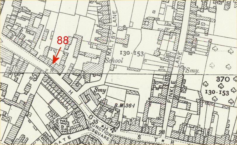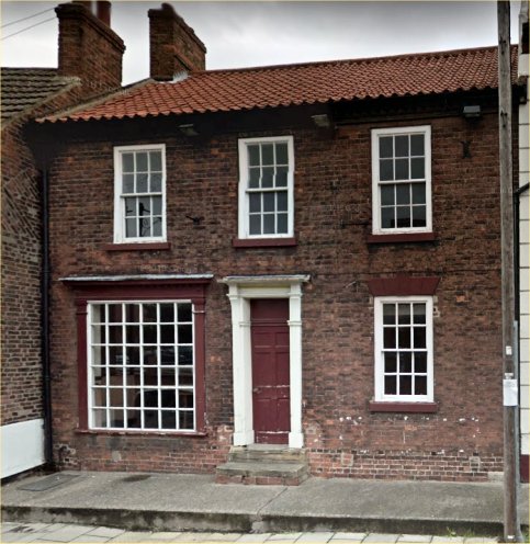 Grade II. Late 18th Century. Two storeys in brick with pantile roof and diagonal-set brick eaves cornice. Three windows, centre blocked, hung sashes with glazing bars, one window to ground floor with modern glazing bars, rusticated lintel with keystone. Left-hand shop front with plain pilasters and modillion cornice. Centre doorway with pilasters and hood on brackets. Door of six panels, four glazed, rectangular fanlight.
